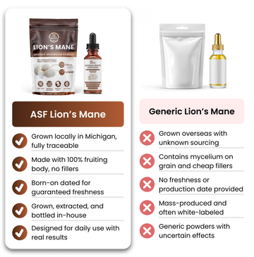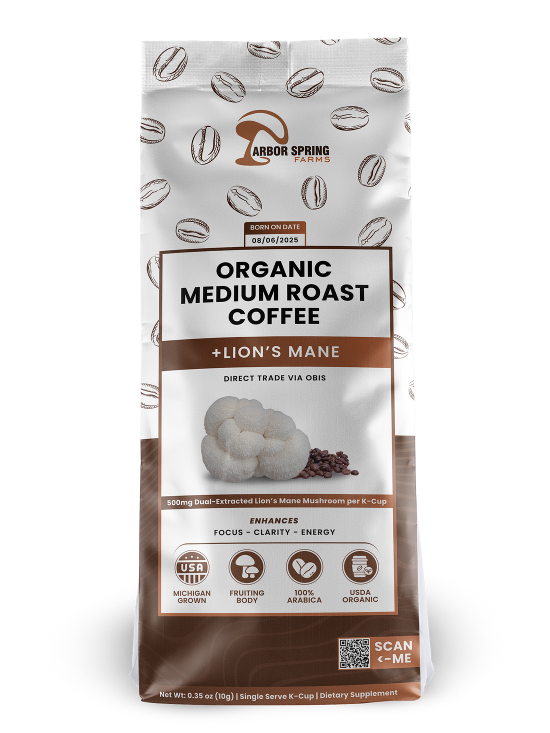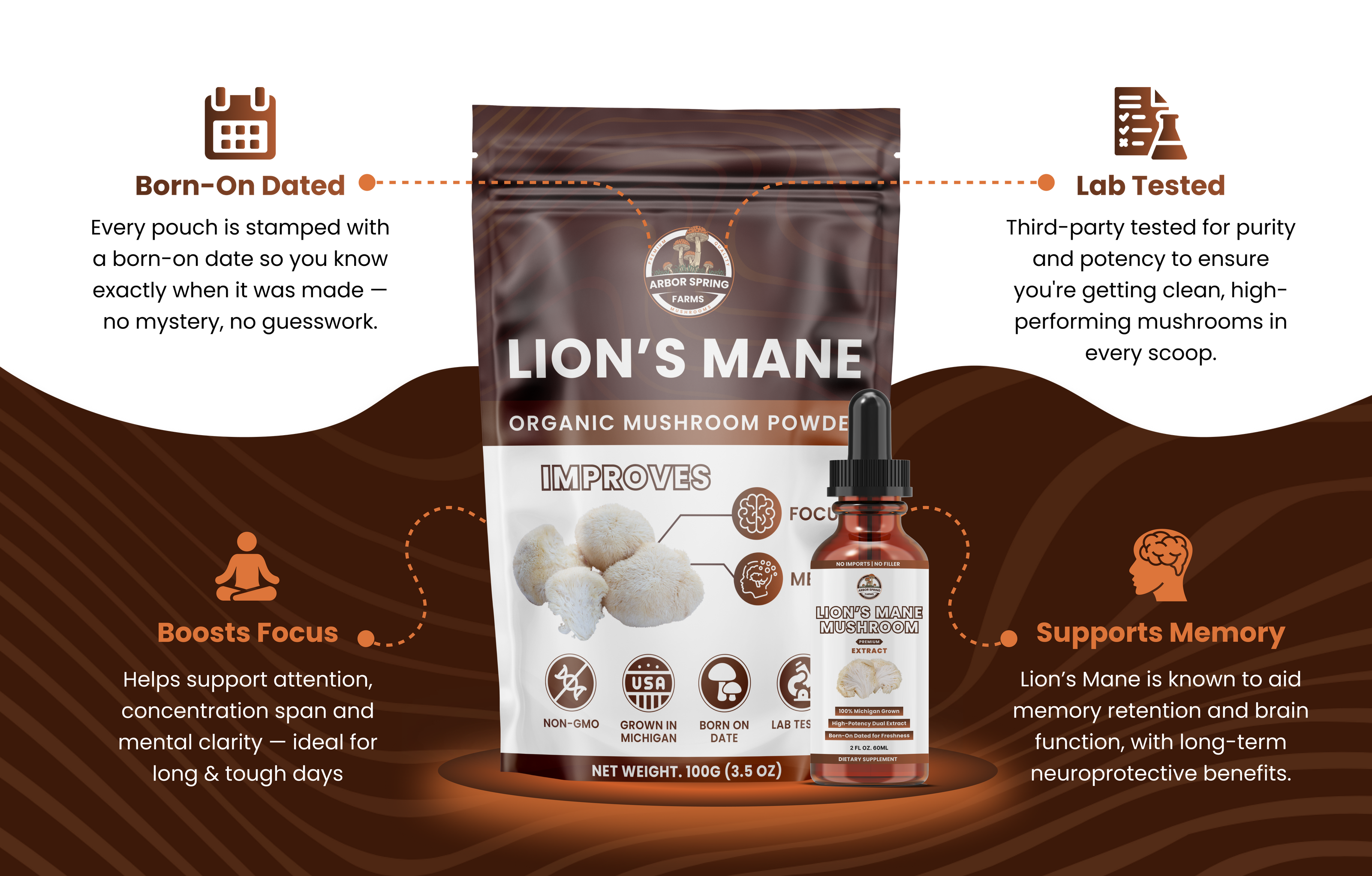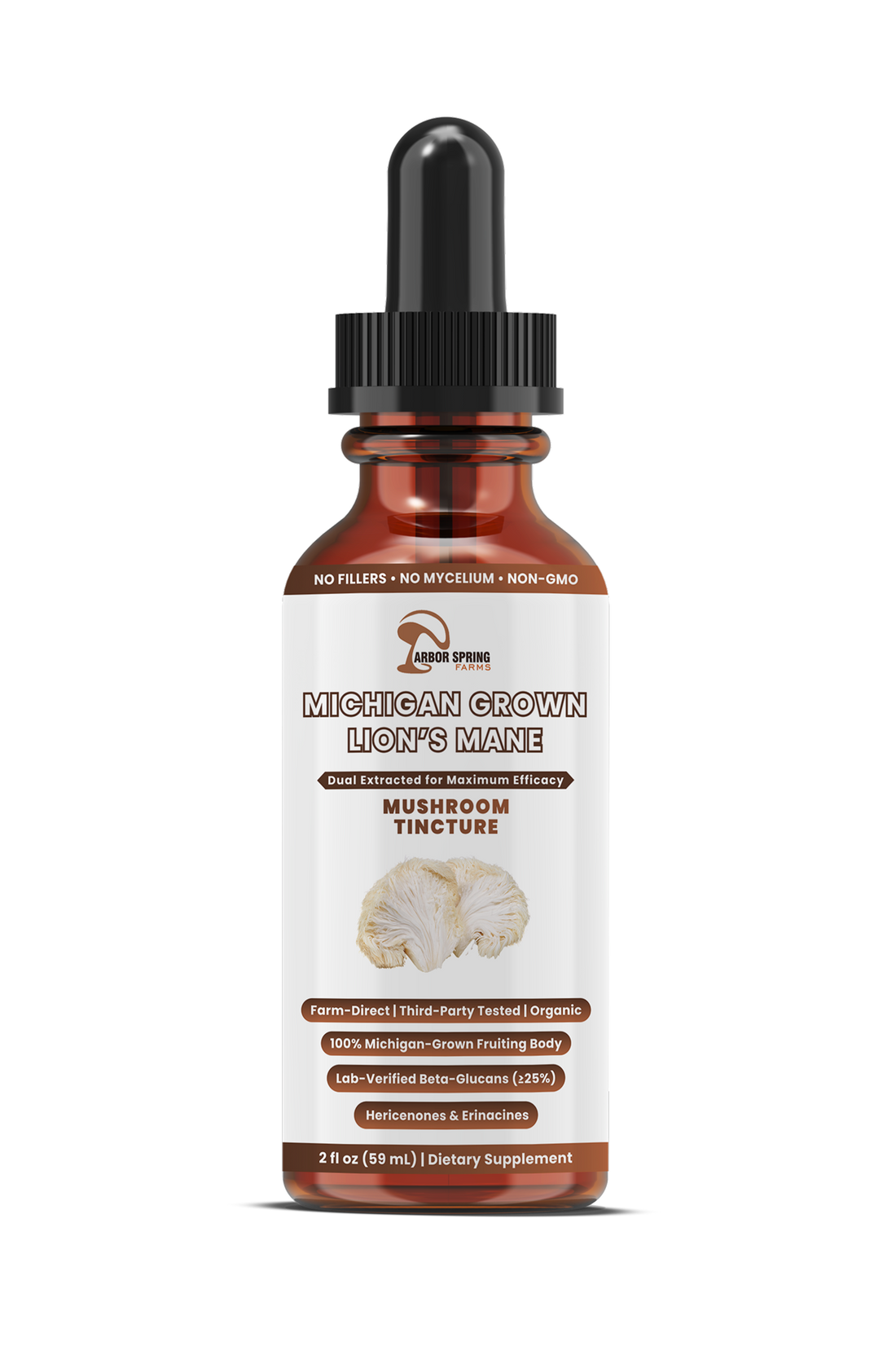 Most Lion’s Mane on the market is grown overseas, processed in bulk, and sold without clear sourcing or testing. At Arbor Spring Farms, we grow our mushrooms right here in Michigan, extract only the fruiting body, and stamp every pouch with a born-on date. This isn’t just a supplement — it’s traceable, intentional wellness.