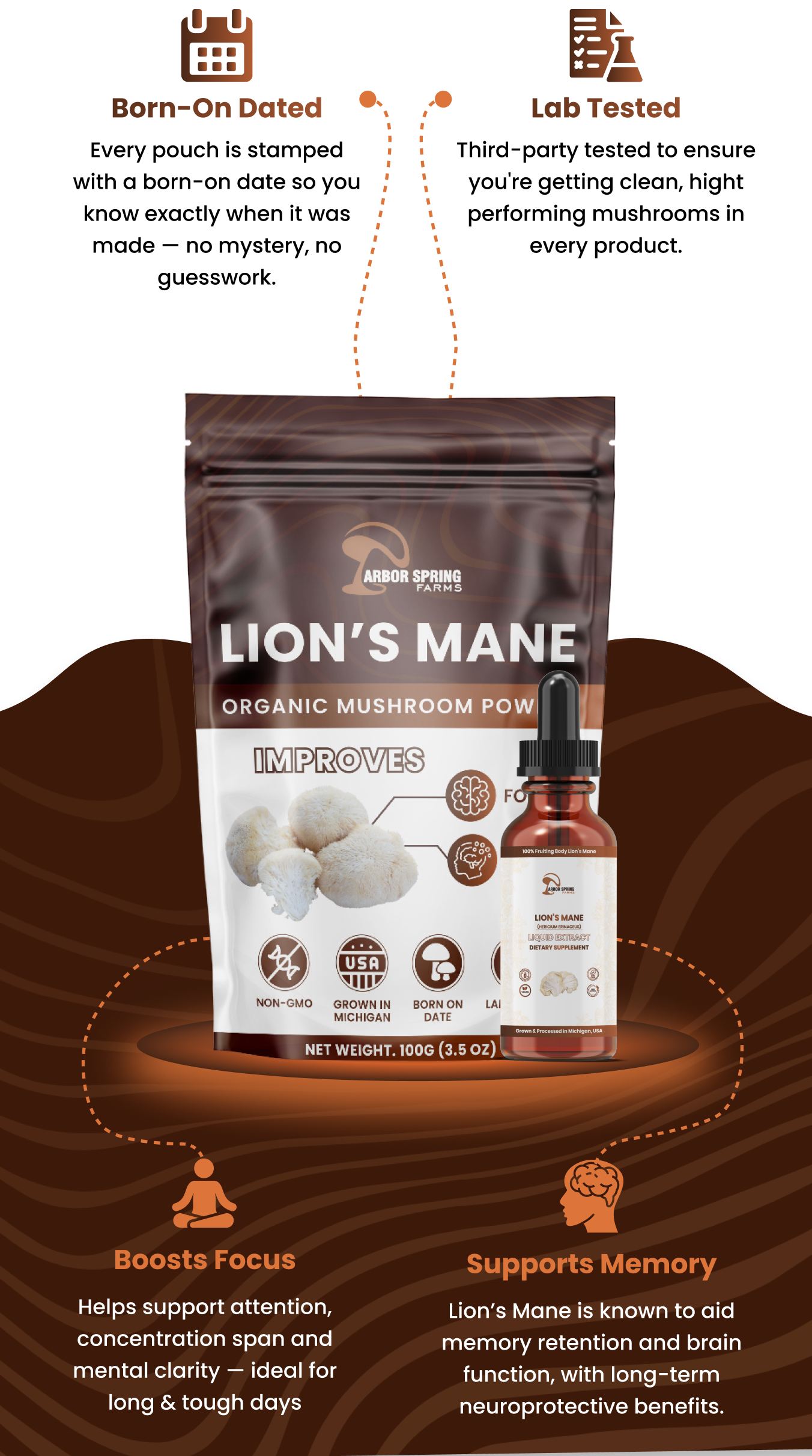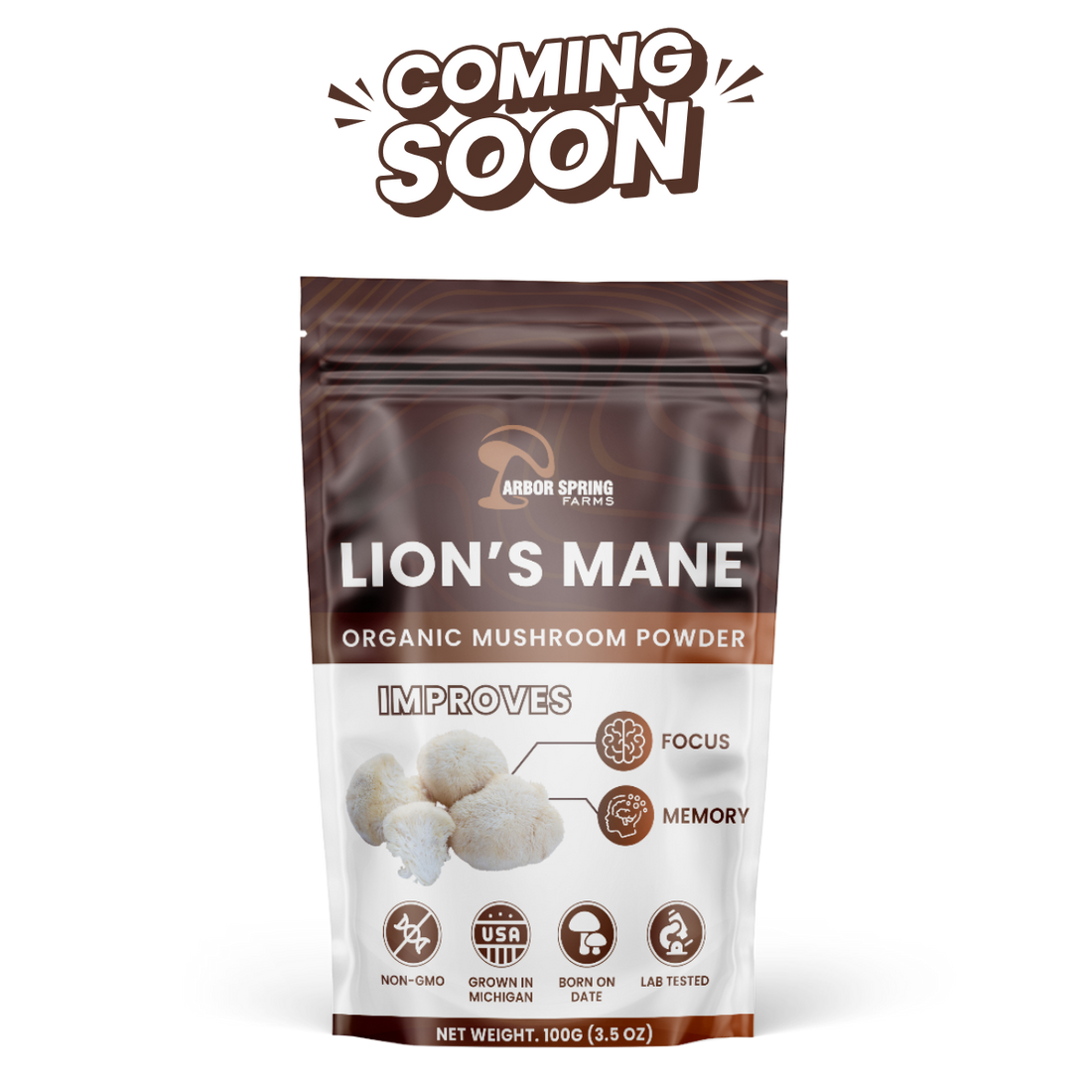 Most Lion’s Mane on the market is grown overseas, processed in bulk, and sold without clear sourcing or testing. At Arbor Spring Farms, we grow our mushrooms right here in Michigan, extract only the fruiting body, and stamp every pouch with a born-on date. This isn’t just a supplement — it’s traceable, intentional wellness.