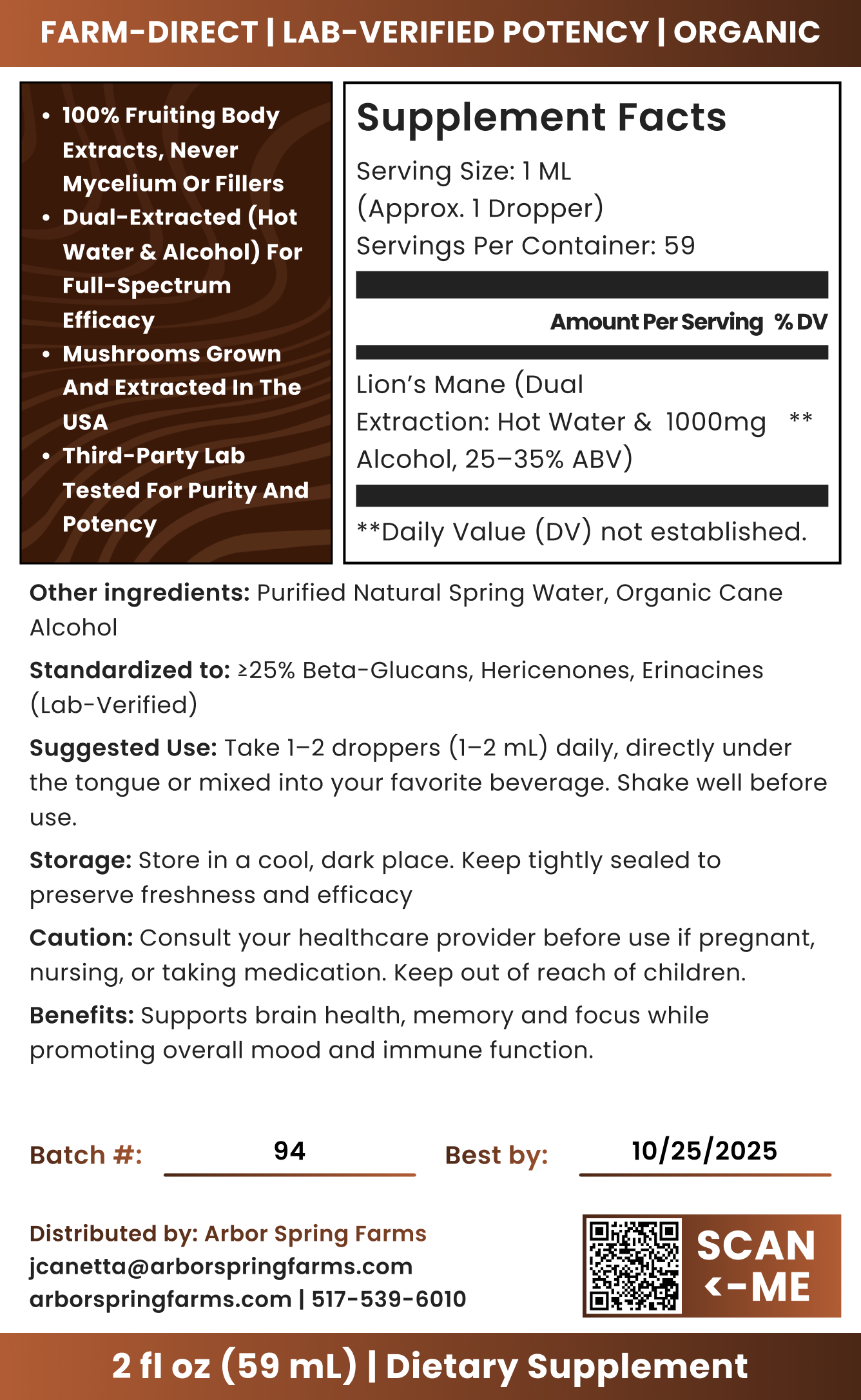 At Arbor Spring Farms, we grow every mushroom ourselves — Lion’s Mane for focus, Cordyceps for energy — all right here in Michigan. No imports, no fillers, no shortcuts. Whether it’s a tincture, powder, or coffee, every format is born in real soil, batch-tested, and built to work.